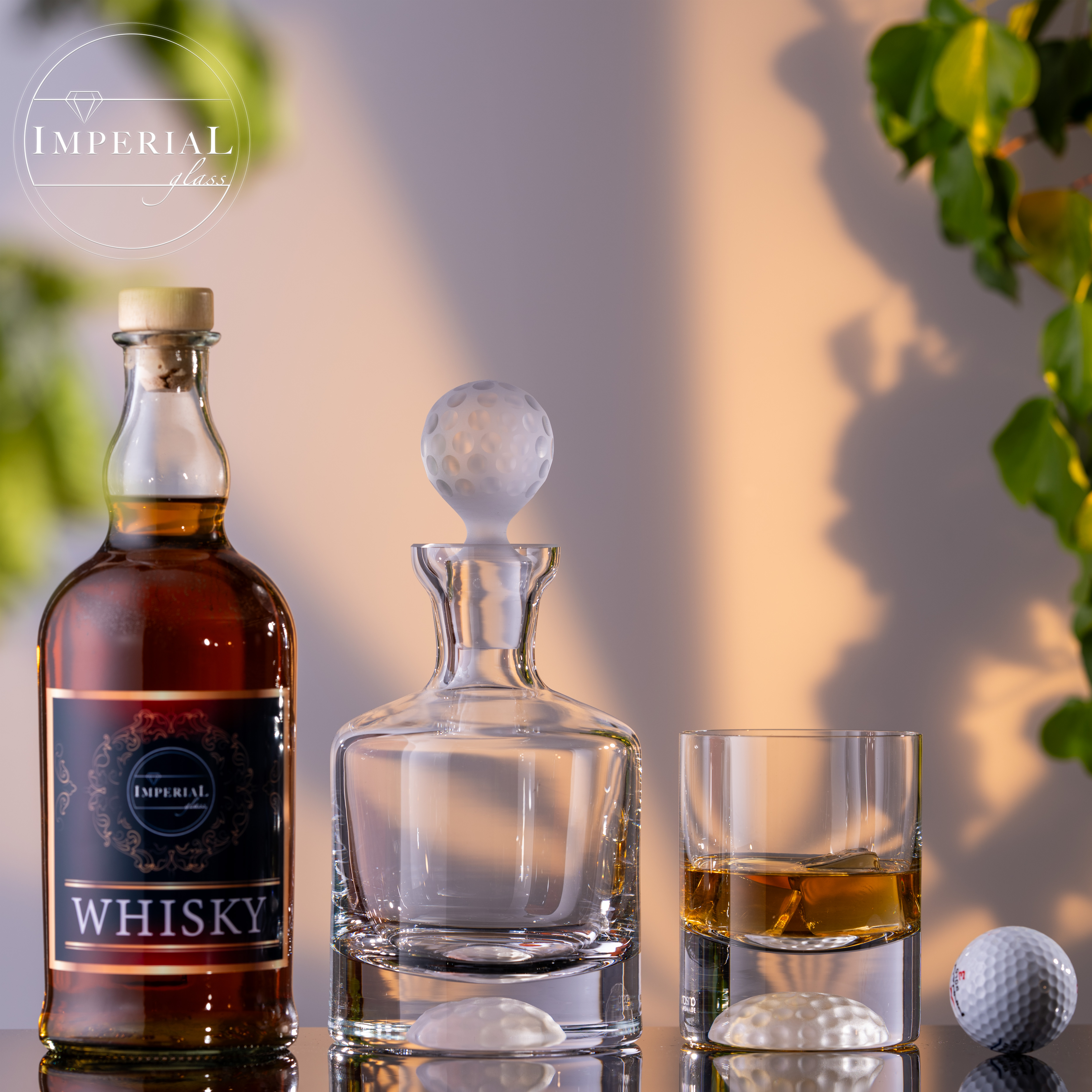 Das IMPERIAL Whisky-Set vereint sportliche Eleganz mit funktionalem Design. Die aus hochwertigem Crystalline Glas gefertigte Glaskaraffe mit passendem Stopfen und vier Gläsern beeindruckt durch ihre präzise Verarbeitung und klare Formensprache. Der Stopfen in Golfball-Optik und die feine Golfball-Struktur im Glasboden verleihen dem Set eine unverwechselbare Note – perfekt für Golf- und Whiskeyliebhaber.