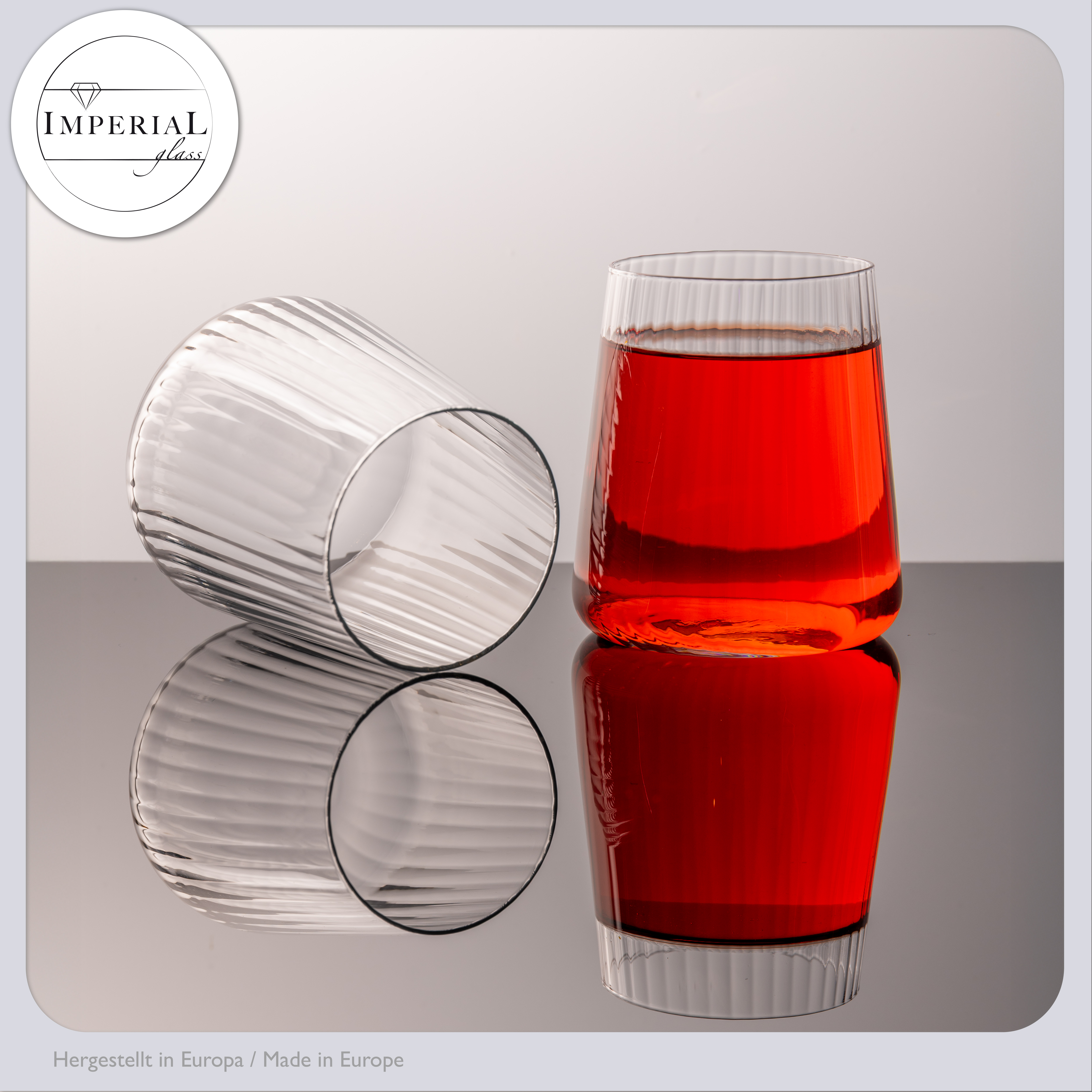 Die IMPERIAL Trinkgläser der Kollektion „London“ verbinden klassisches Design mit moderner Ästhetik. Ihre fein geriffelte Oberfläche und die zylindrische Form verleihen jedem Getränk einen eleganten Auftritt. Ob Wasser, Säfte oder Cocktails – das klare Crystalline Glas sorgt für brillante Transparenz und ein angenehmes Trinkgefühl.