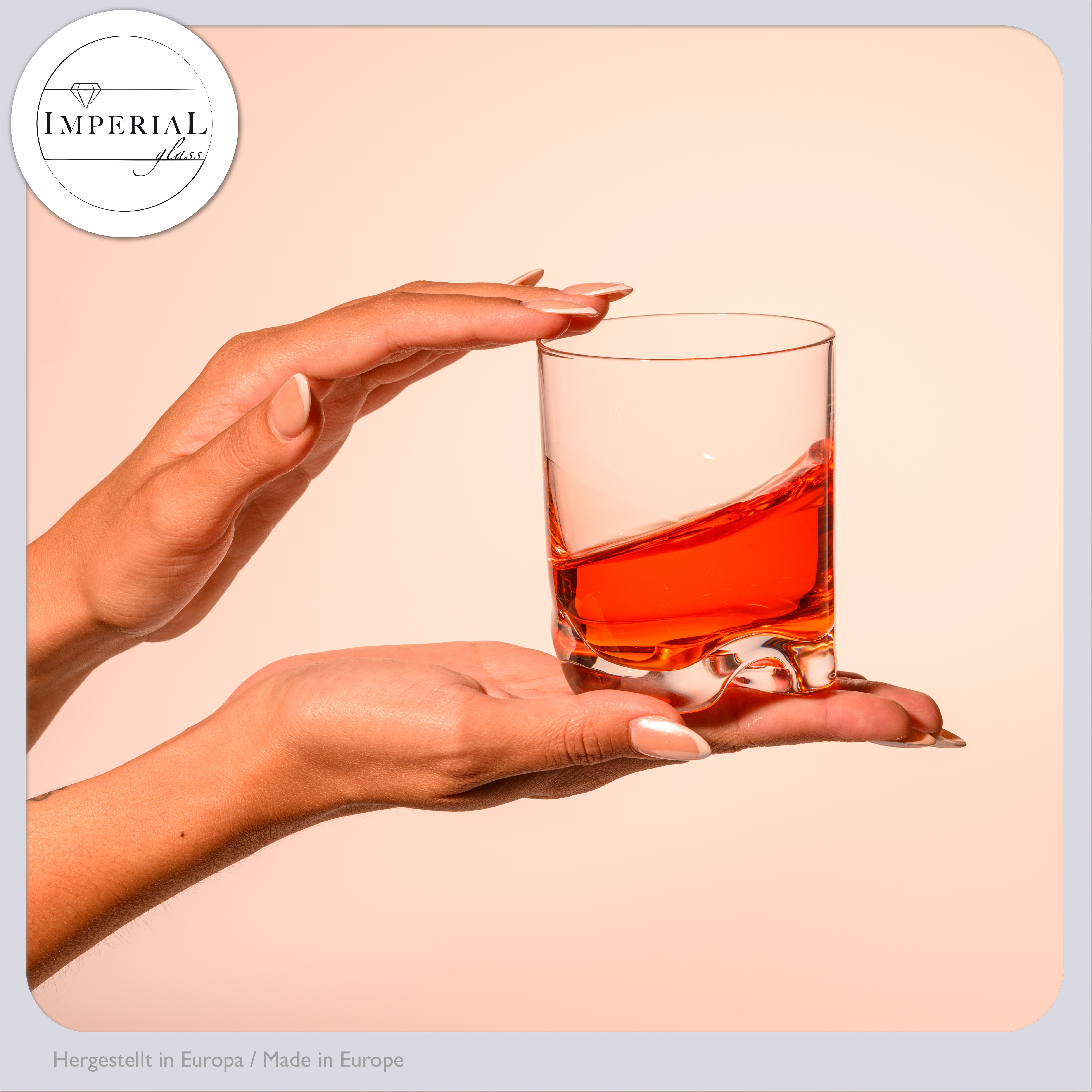 - Der Designboden mit geformter Struktur und wellenförmigem Verlauf erzeugt eine besondere Optik im Glas. Licht und Flüssigkeit werden sichtbar bewegt, wodurch das Whiskyglas einen charakteristischen Look erhält, der sich von klassischen glatten Böden abhebt.