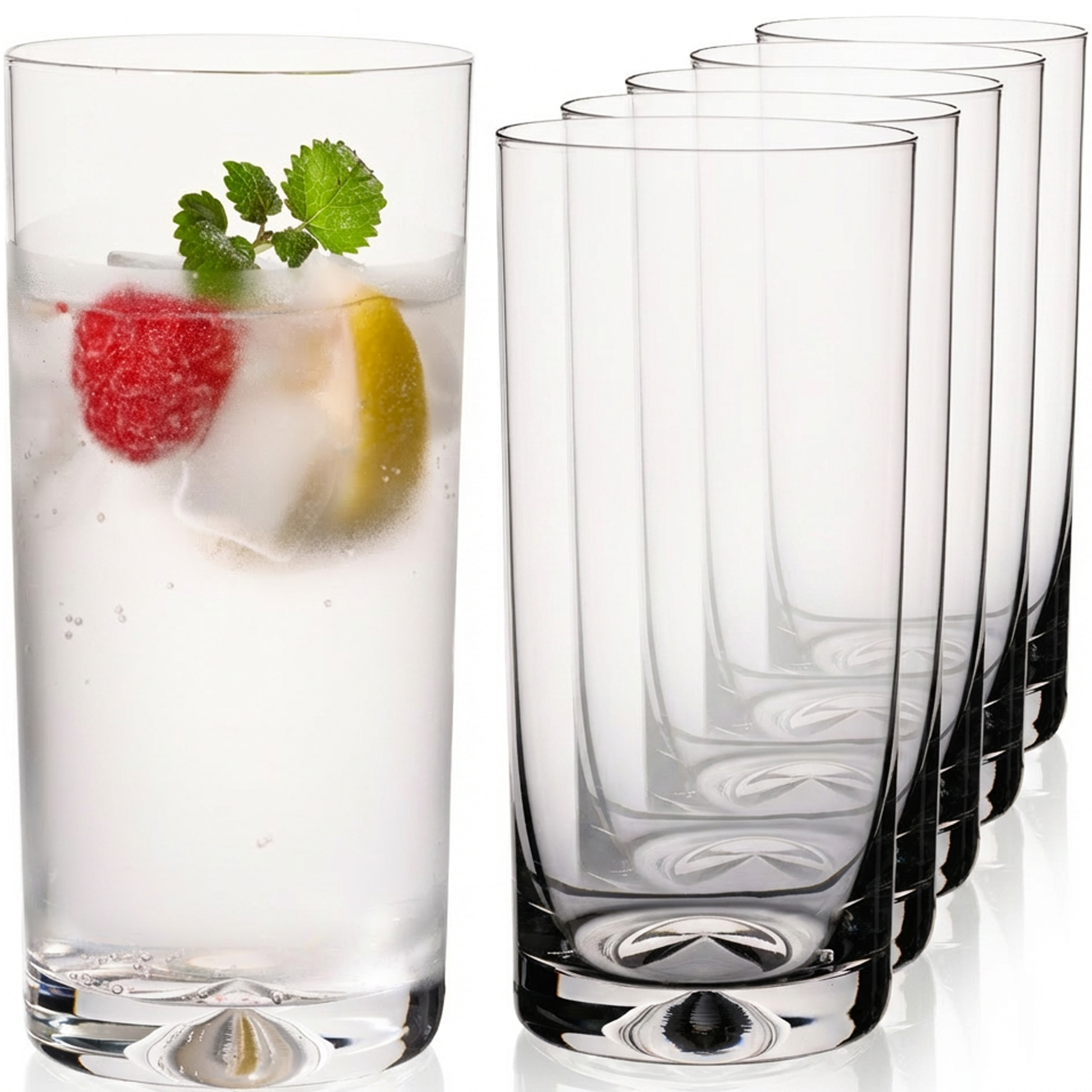 Klare Formen und eine ausgewogene Linienführung prägen dieses Trinkgläser Set und machen es zu einer vielseitigen Ergänzung für Tisch und Bar. Die hohe schlanke Silhouette mit leicht konischer Form sorgt für eine moderne, ruhige Optik, die sich harmonisch in unterschiedliche Umgebungen einfügt. Gefertigt aus bleifreiem Crystalline Glas entsteht eine transparente, klare Erscheinung mit angenehmer Haptik. Der geformte Boden mit optischer Struktur und leichter Mulde unterstützt einen stabilen Stand und sorgt für ein sicheres Gefühl beim Abstellen. Dadurch eignen sich die Gläser sowohl für den täglichen Gebrauch als auch für den Einsatz in Gastronomie oder bei Veranstaltungen. Ob Wasser, Saft, Softdrinks oder Longdrinks – das 6er Set bietet eine praktische Größe für viele Getränke. Durch das schlichte Design lassen sich die Mehrzweckgläser flexibel kombinieren und bleiben auch bei regelmäßiger Nutzung dank spülmaschinenfester Verarbeitung pflegeleicht.