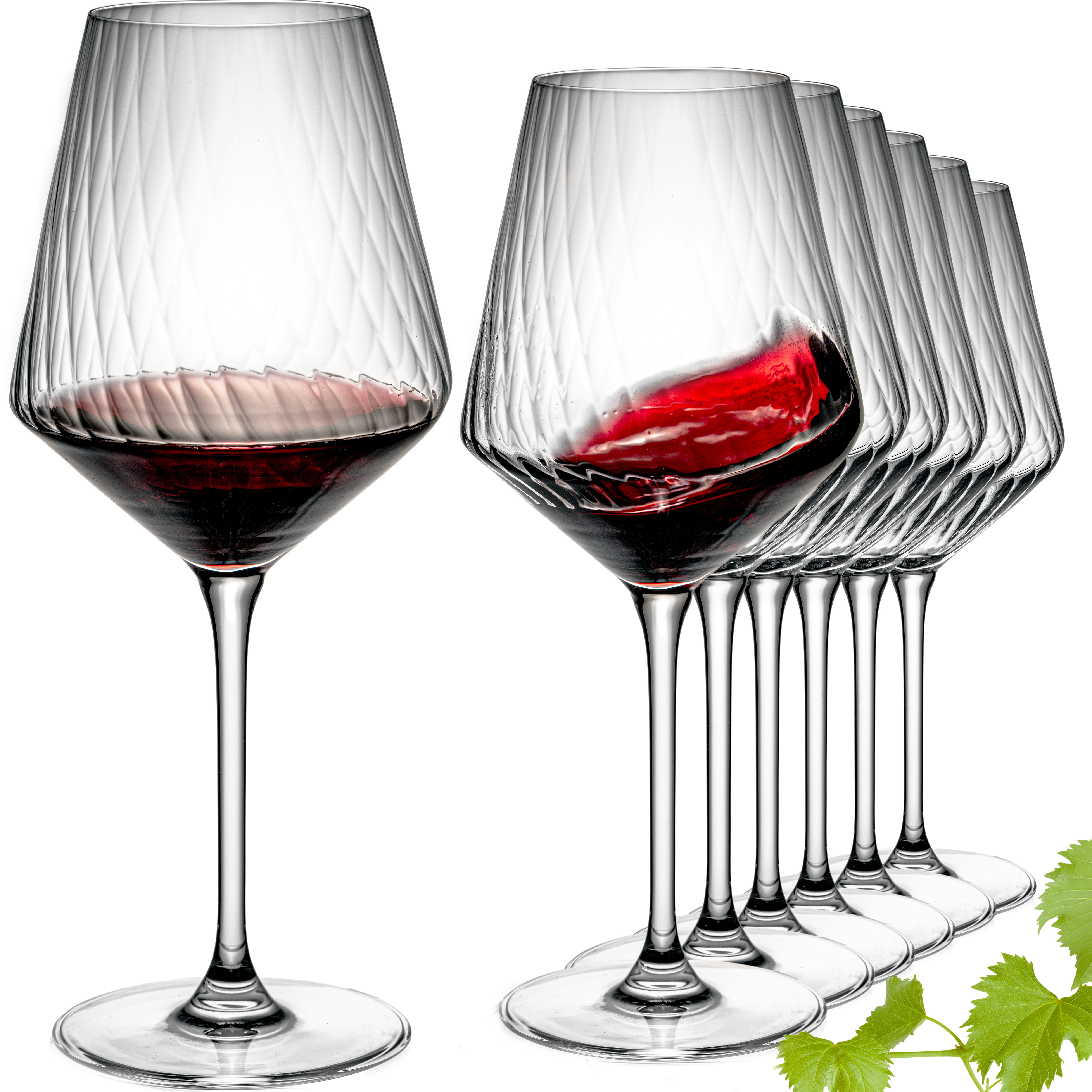 - Langstielige Universalweingläser mit geriffeltem Kelch, dünnem Glas und abgerundetem Trinkrand – betonen die Farbe und Aromen des Weins, ideal für Rot- und Weißweine bei Verkostung, Dinner oder Feier.