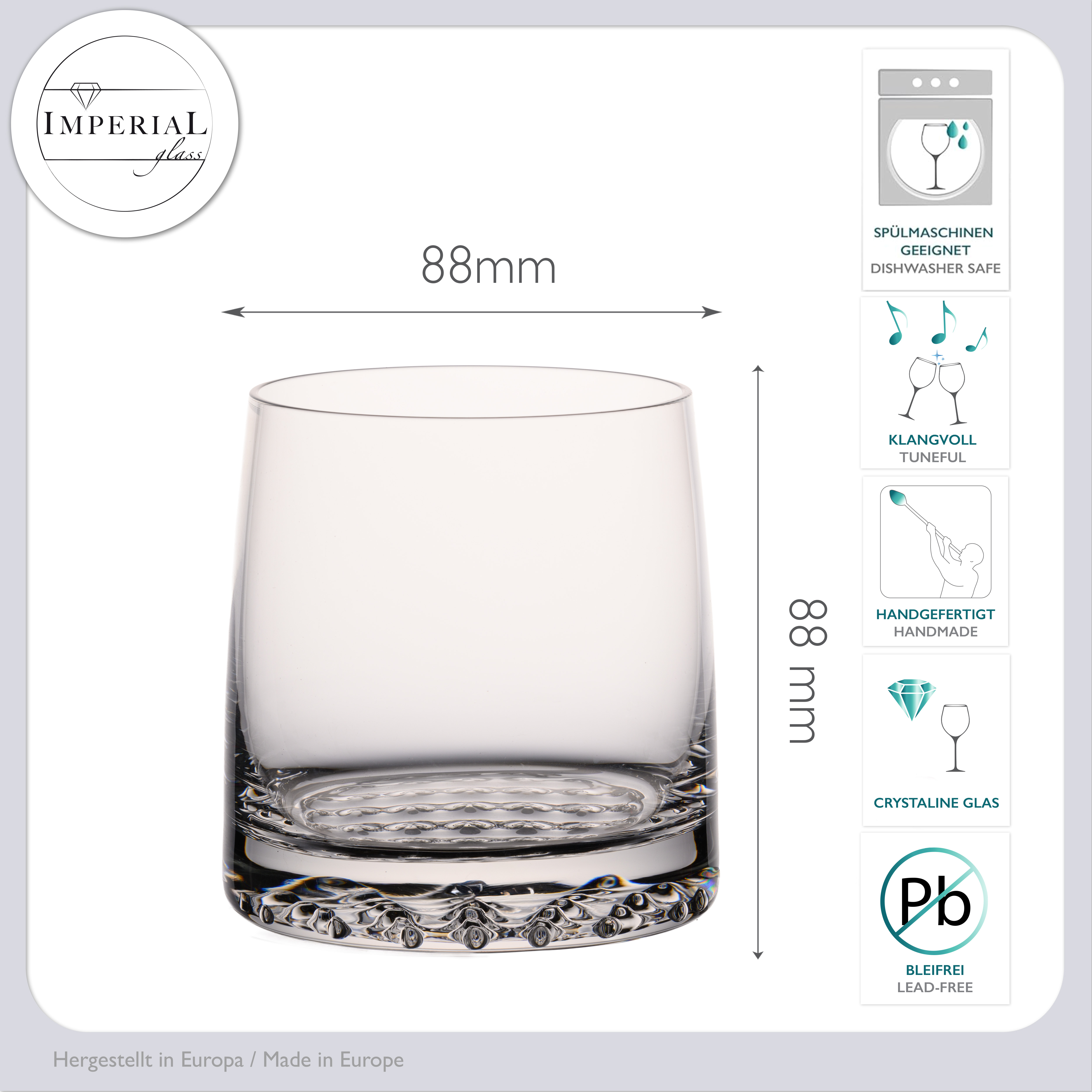 Das Whiskeyglas-Set von IMPERIAL glass kombiniert klare Linien mit einem schweren, strukturierten Boden. Crystalline Glas bietet hohe Transparenz, sodass Whisky, Drinks on the rocks oder Degustationsproben wirkungsvoll präsentiert werden. Die leicht konische Silhouette mit abgerundetem Trinkrand unterstützt ein angenehmes Trinkgefühl bei jedem Schluck.