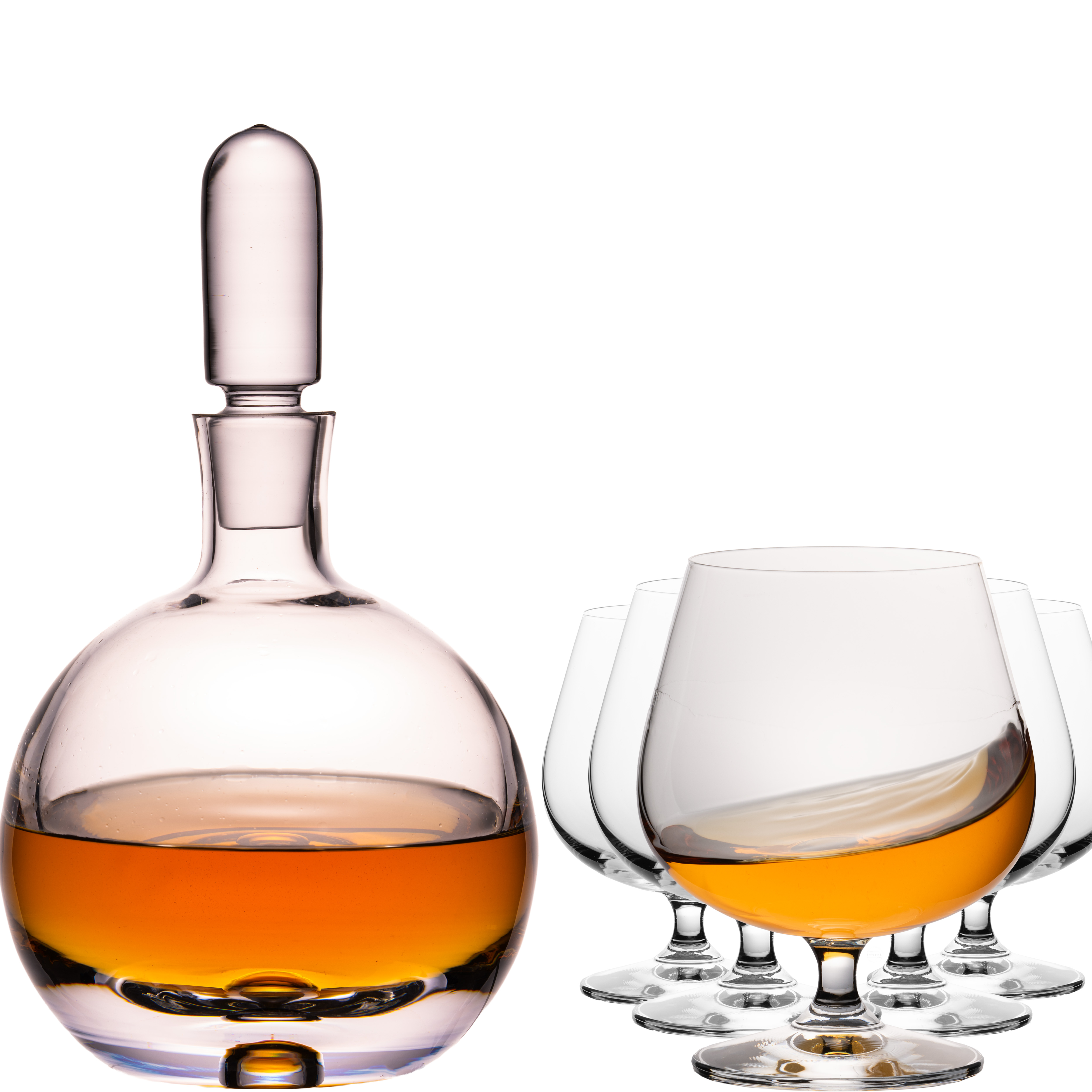 Dieses Set aus Cognackaraffe und sechs passenden Cognacgläsern verbindet elegantes Design mit handwerklicher Verarbeitung. Die bauchige Karaffe mit Glasstopfen wird aus bleifreiem Crystalline Glas gefertigt und zeichnet sich durch ihre glasklare Transparenz sowie eine dekorative Luftblase im Boden aus.