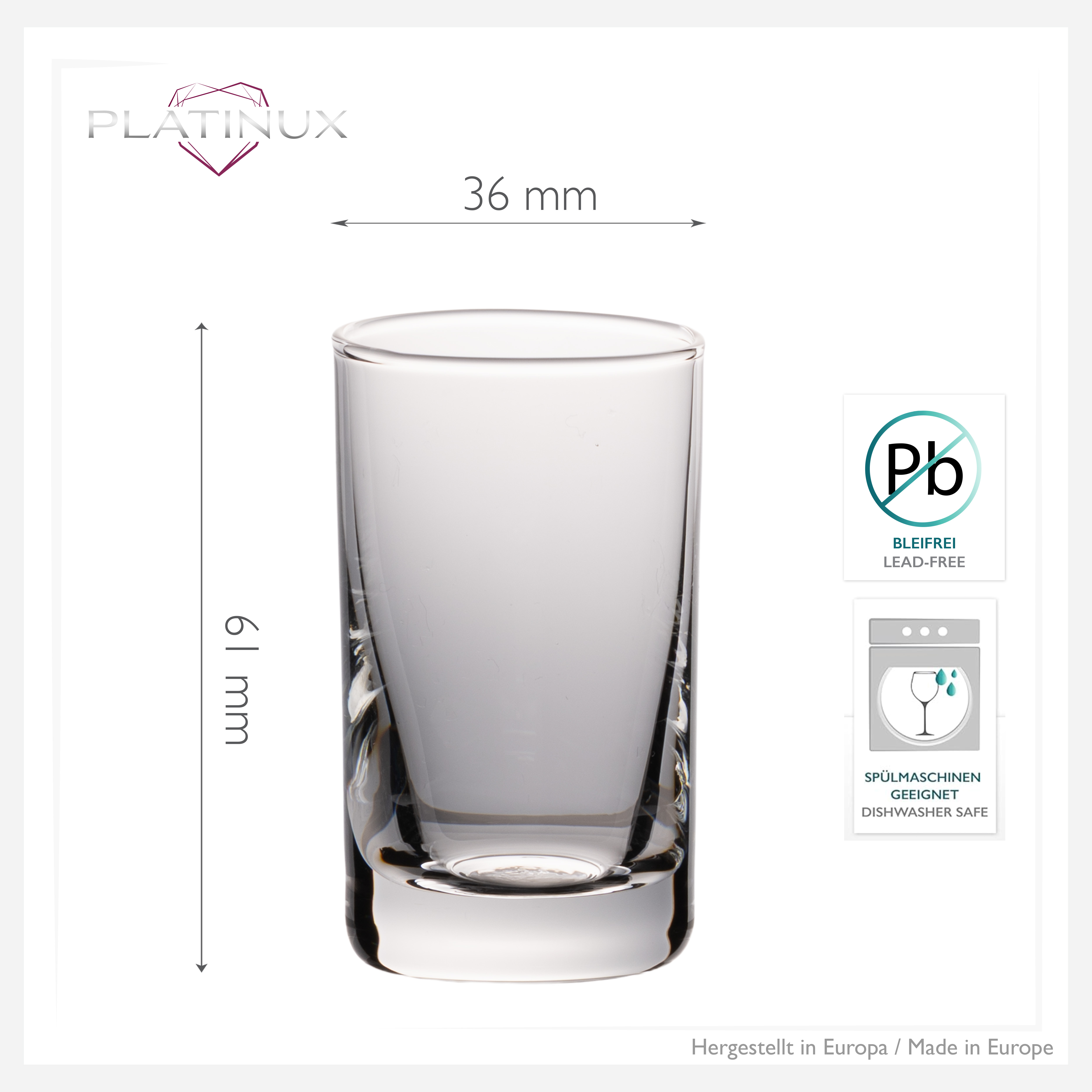 Hergestellt in Europa aus bleifreiem Glas bieten die mini Schnapsgläser eine langlebige Qualität, die sich im täglichen Gebrauch bewährt. Sie sind spülmaschinenfest und somit einfach zu reinigen, was sie besonders praktisch in der Gastronomie oder im Privathaushalt macht.