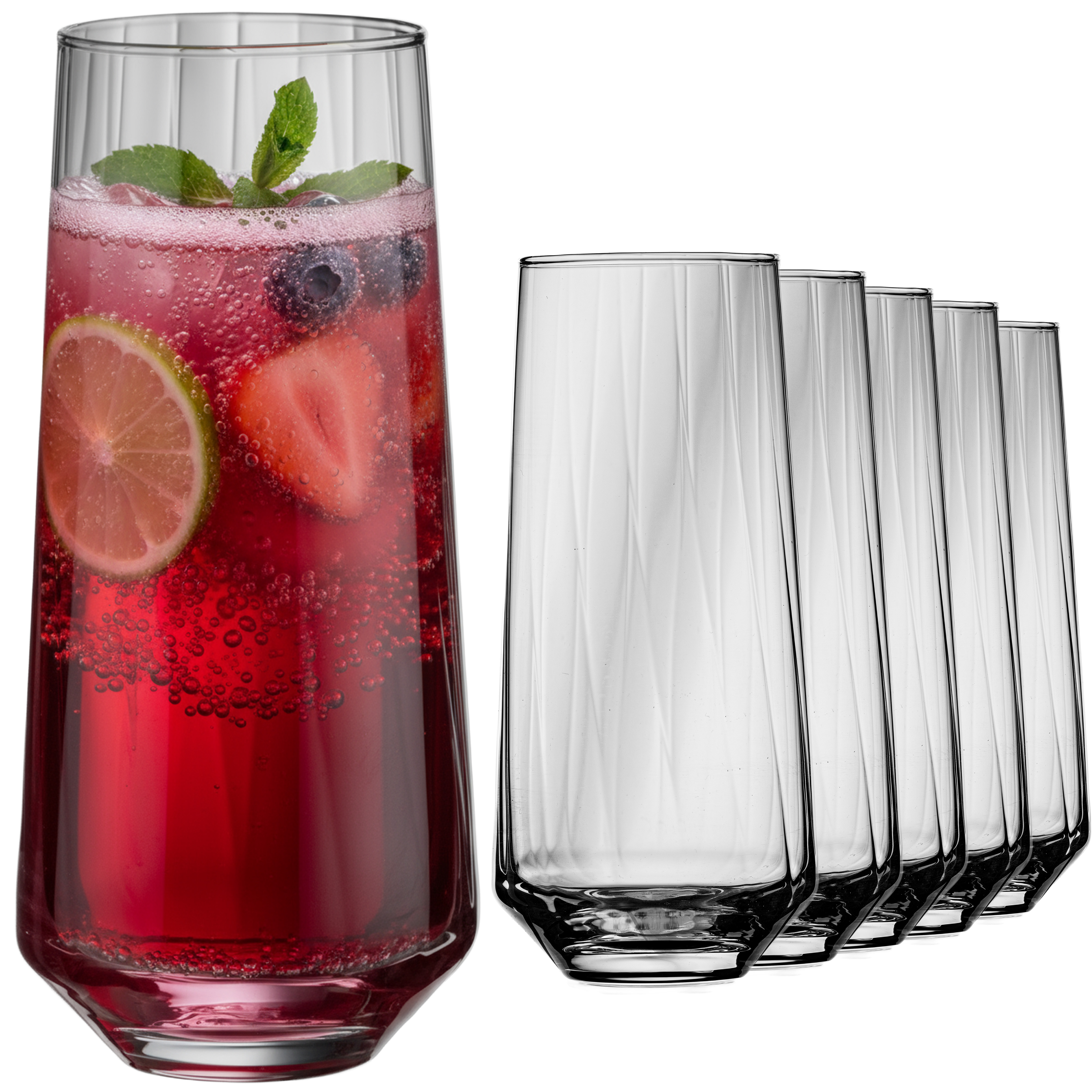 - Modernes Longdrinkglas mit schlanker, leicht konischer Form und vertikal geriffelter Struktur – ideal für stilvolles Servieren bei Feierlichkeiten, Partys oder im Alltag.