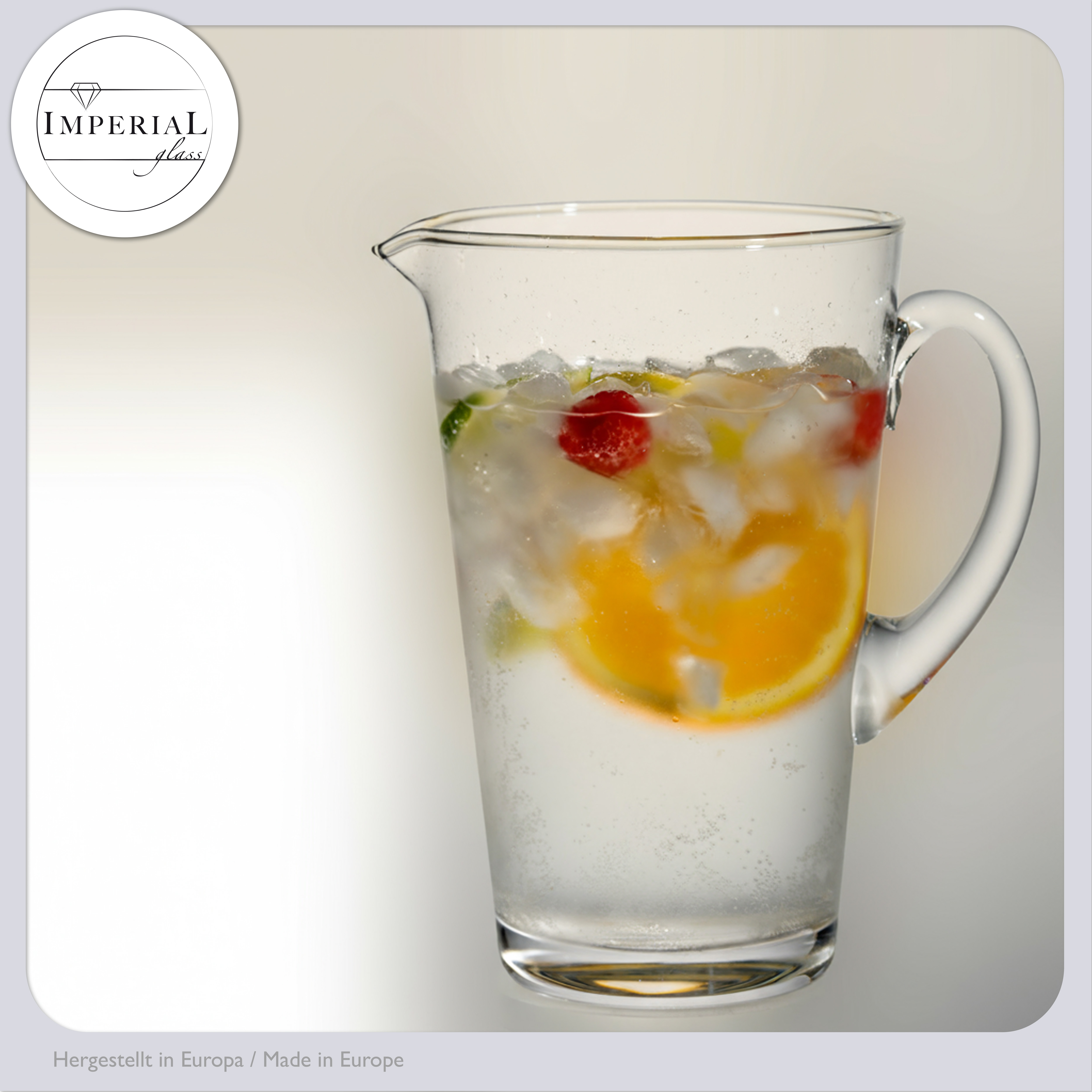 Die IMPERIAL Wasserkaraffe aus der Rom Serie verbindet funktionales Design mit handwerklicher Qualität. Das klare, bleifreie Crystalline Glas überzeugt durch hohe Brillanz und Stabilität. Mit einem Fassungsvermögen von 1,68 Litern (empfohlen bis 1,2 L) eignet sich die Saftkaraffe perfekt zum Servieren von Wasser, Saft, Eistee oder Sangria. Der stark geformte Henkel sorgt für einen sicheren Halt, während der präzise Ausgießer ein sauberes Einschenken ermöglicht.