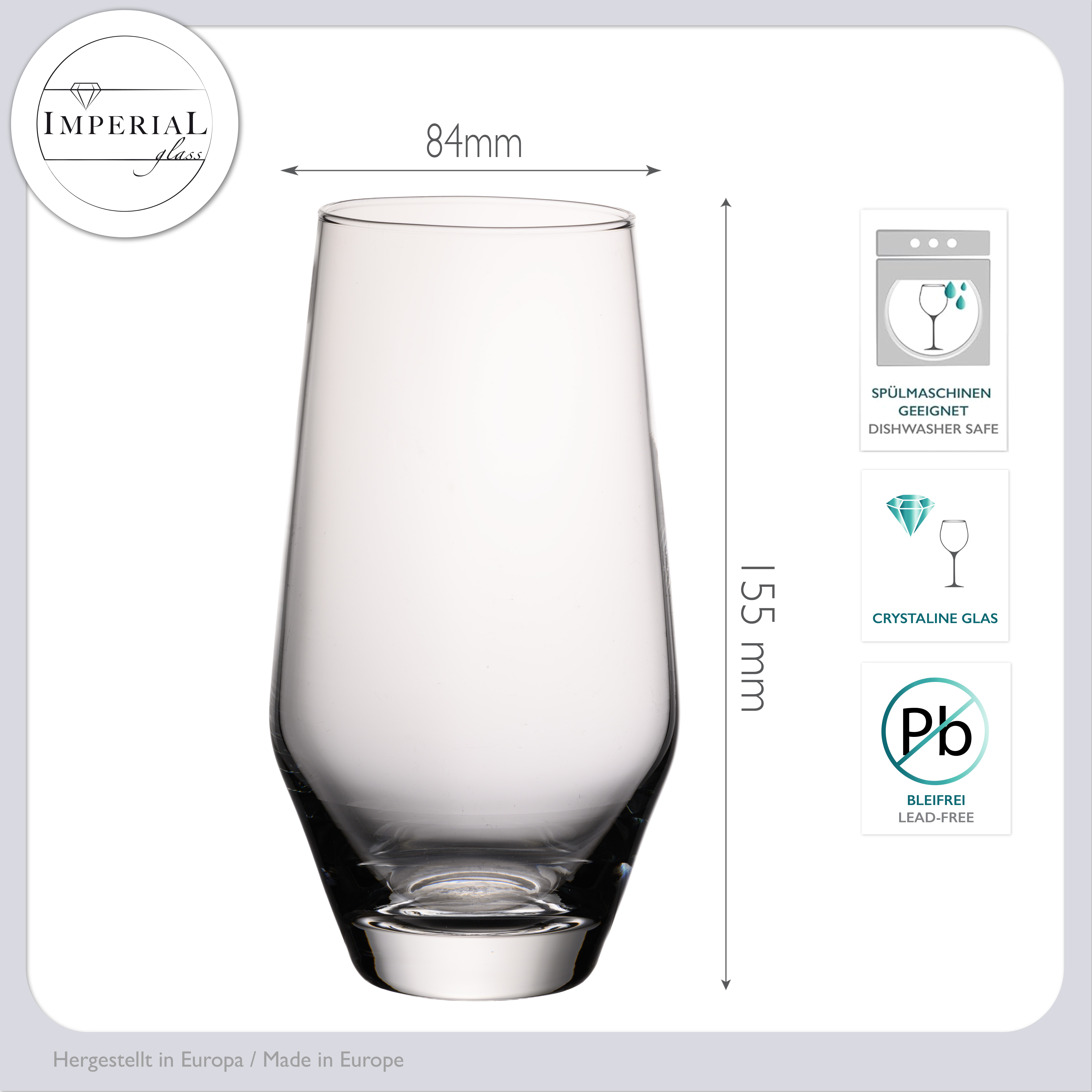 - Details Glas: Länge/Breite: 8,4cm – Höhe: 15,5cm – Durchmesser: 8,4cm – Gesamtvolumen: 520 ml – Füllempfehlung: 400 ml – 6 Gläser – Crystalline Glas, Bleifrei – Gewicht: 228g – dickwandig, ausgewogene Form mit stabilem Boden für sicheren Stand.
