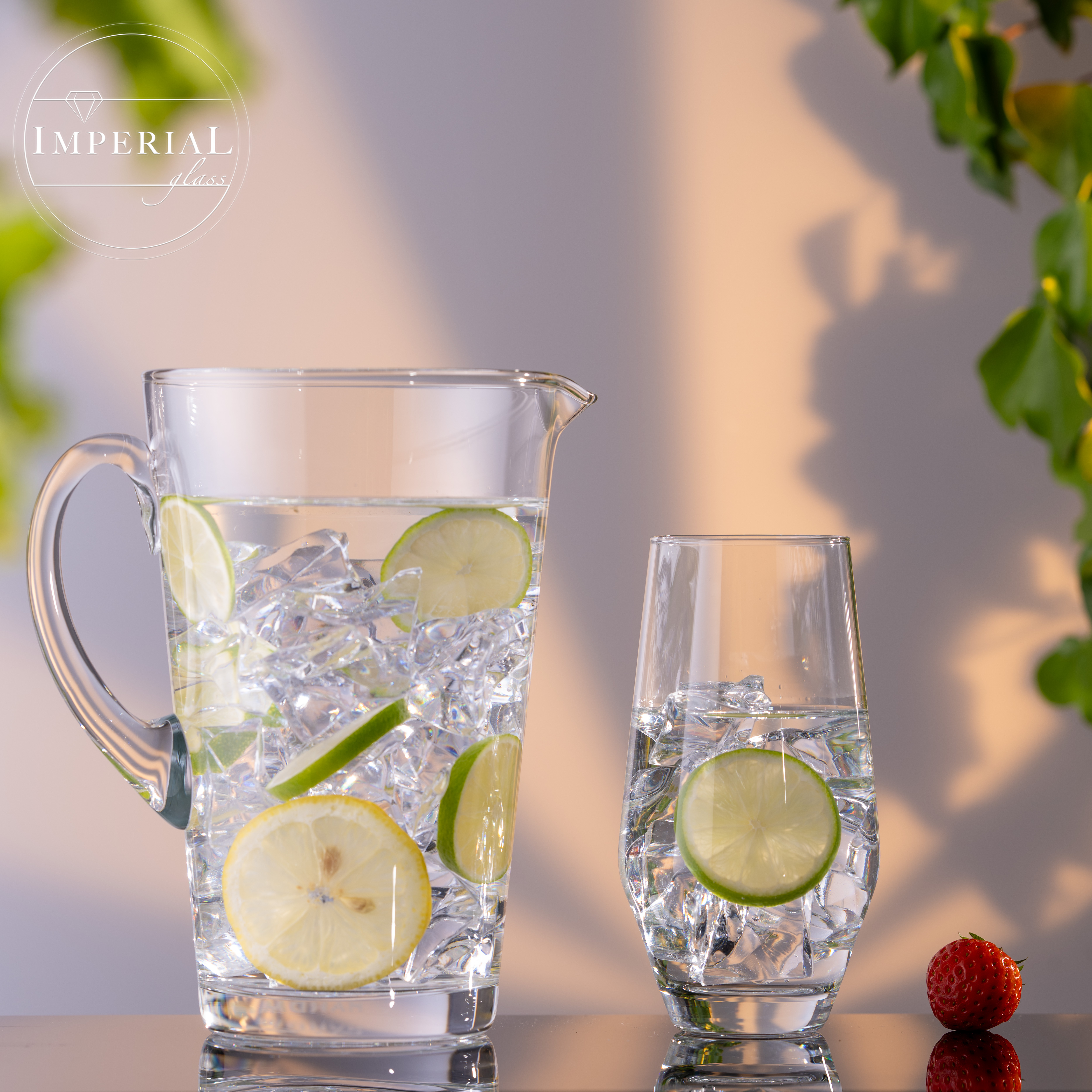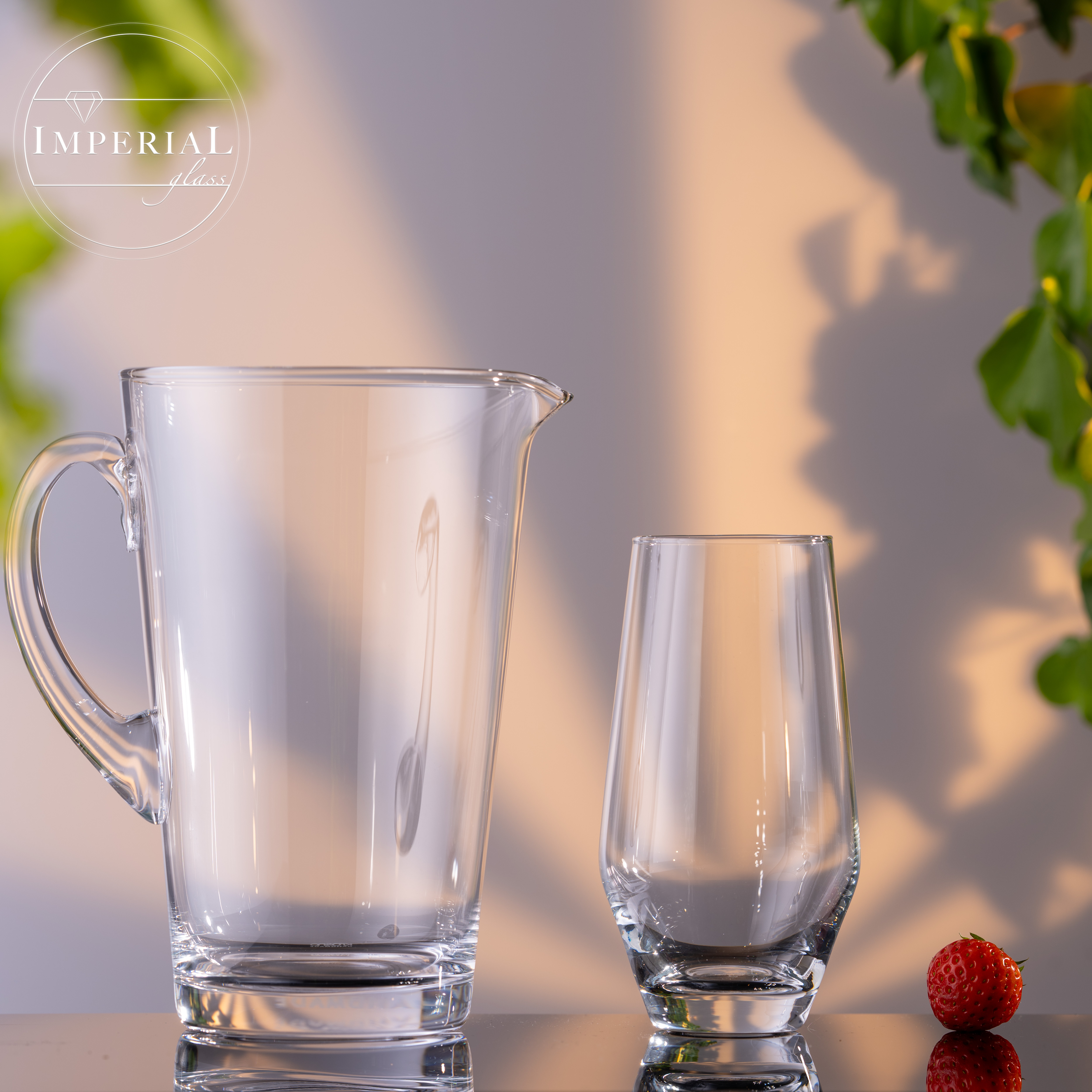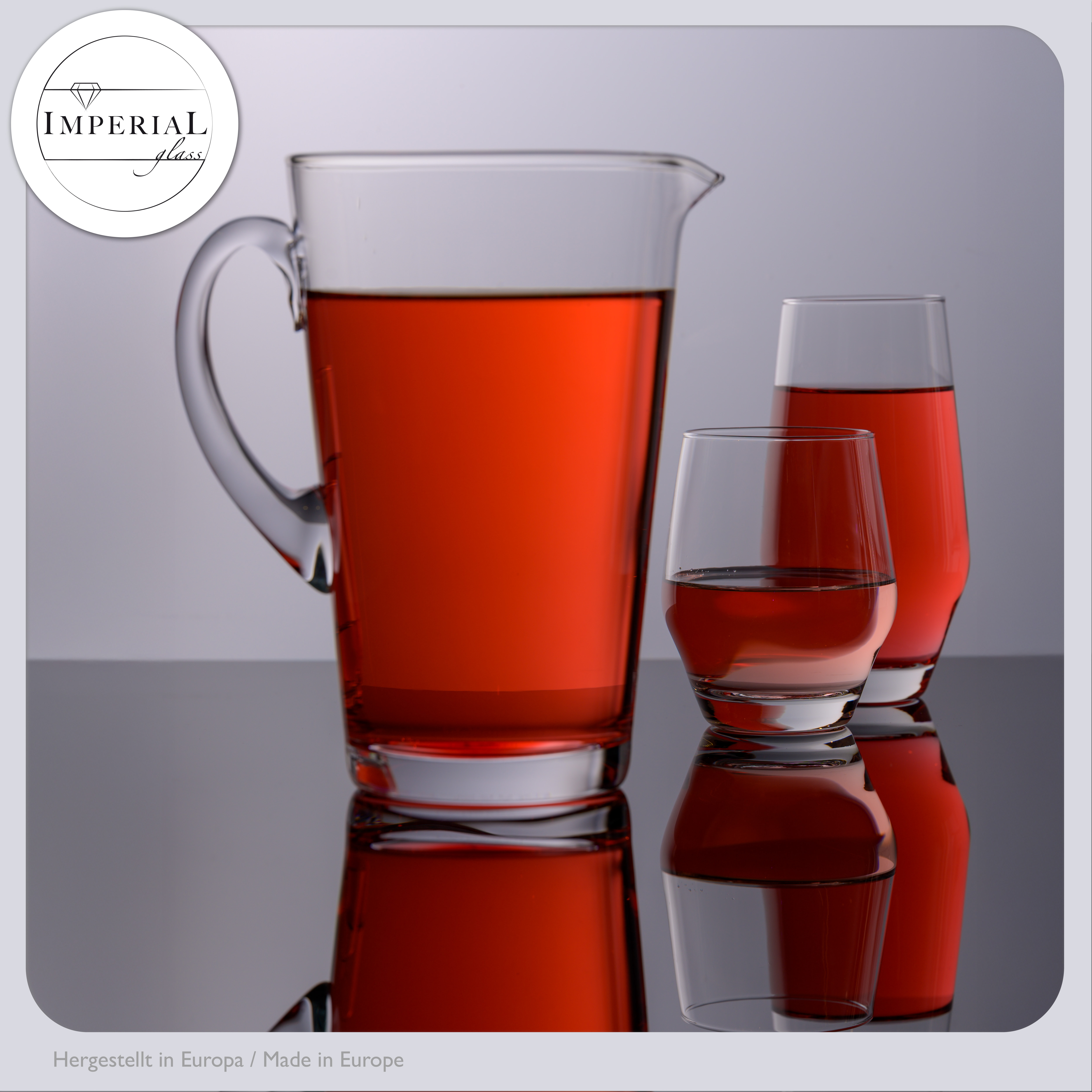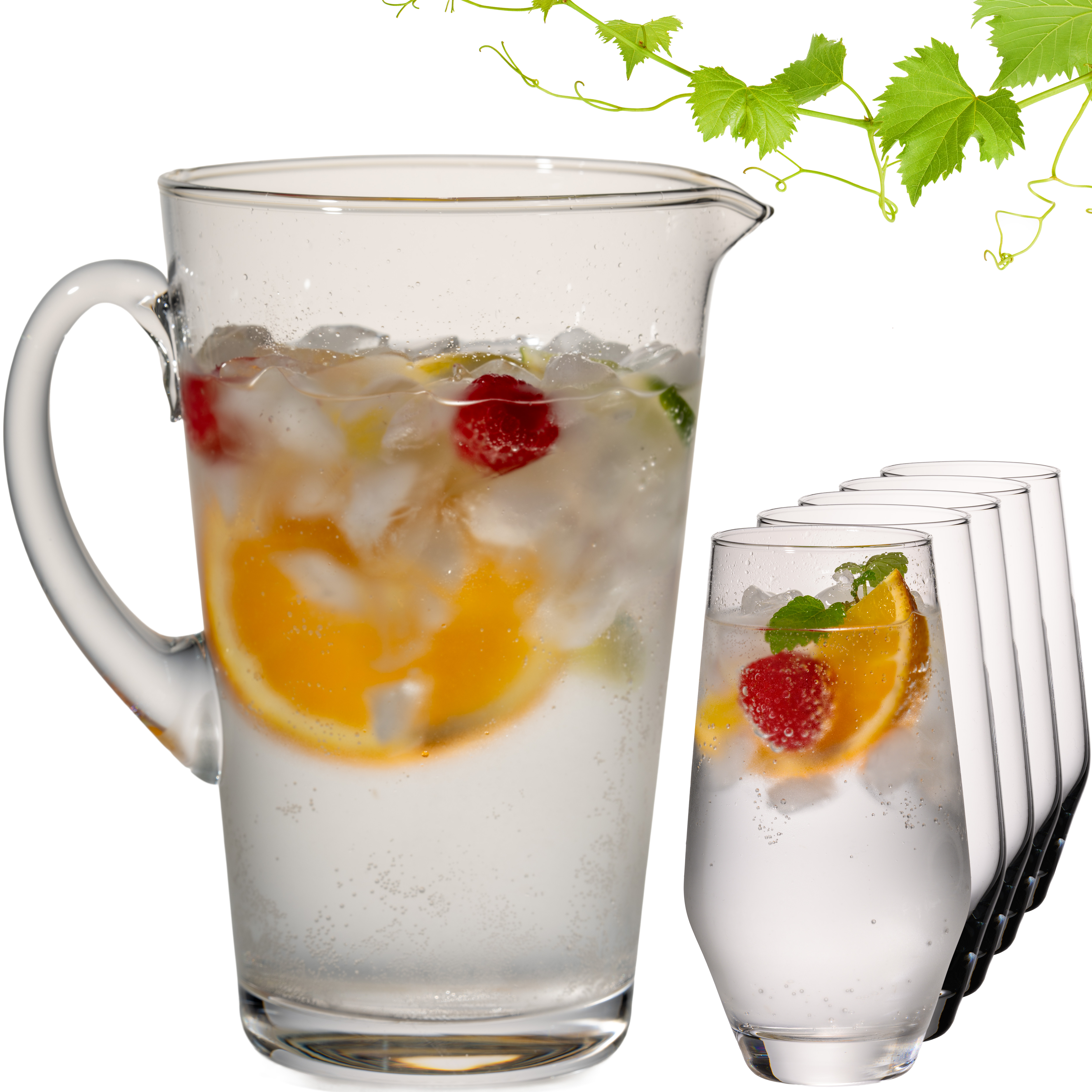 Ob Wasser, Saft, Eistee oder Sangria – das Set ergänzt jede Tischdekoration und passt zu privaten Anlässen ebenso wie zu professionellen Umgebungen. Der stabile Boden, der weite Ausguss und der angenehm griffige Henkel ermöglichen komfortables Einschenken.