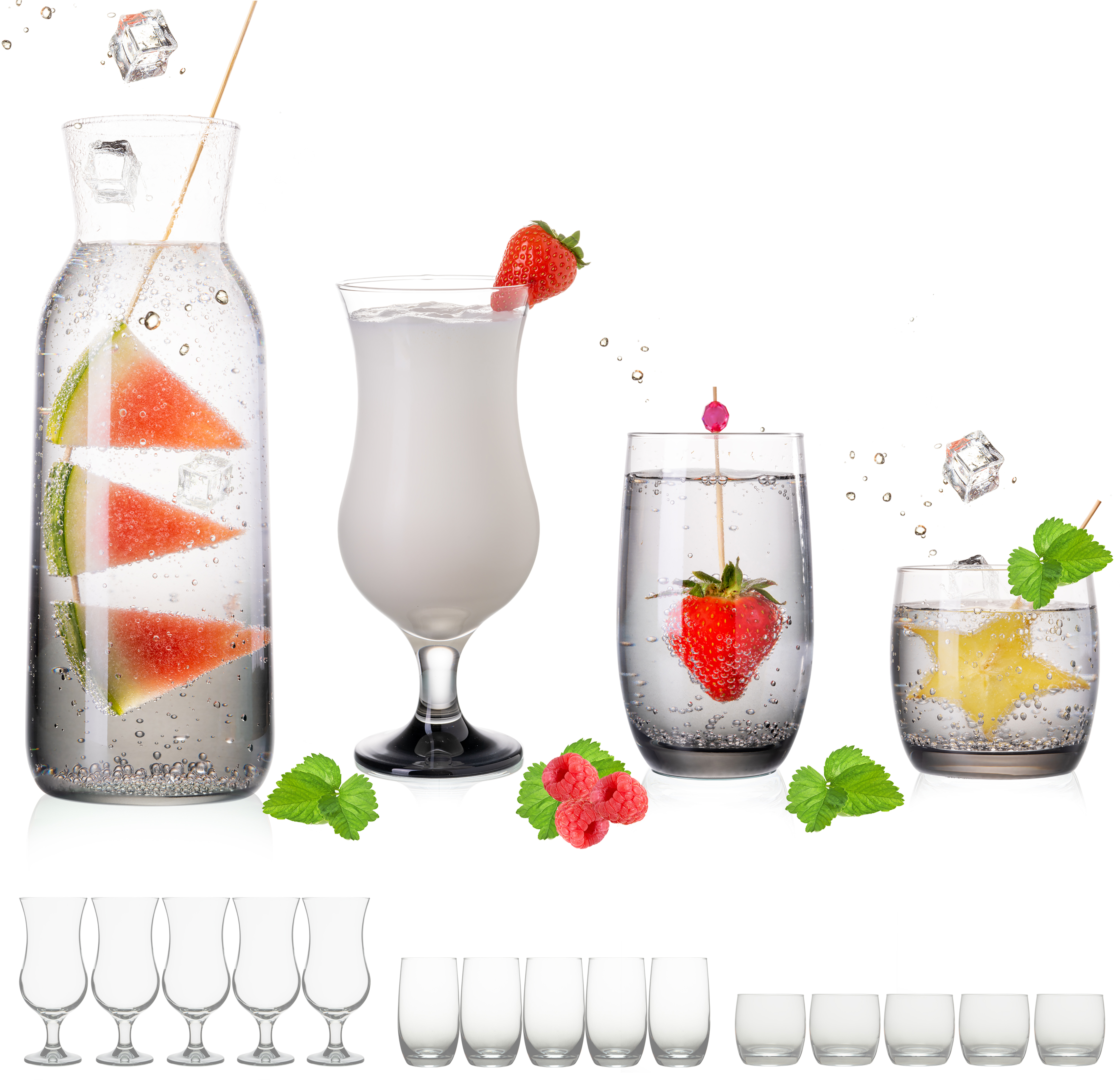 Gläser-Set mit Karaffe, Trinkgläser und Cocktailgläser mit Schwarzer-Tönung im Ombré-Effekt.