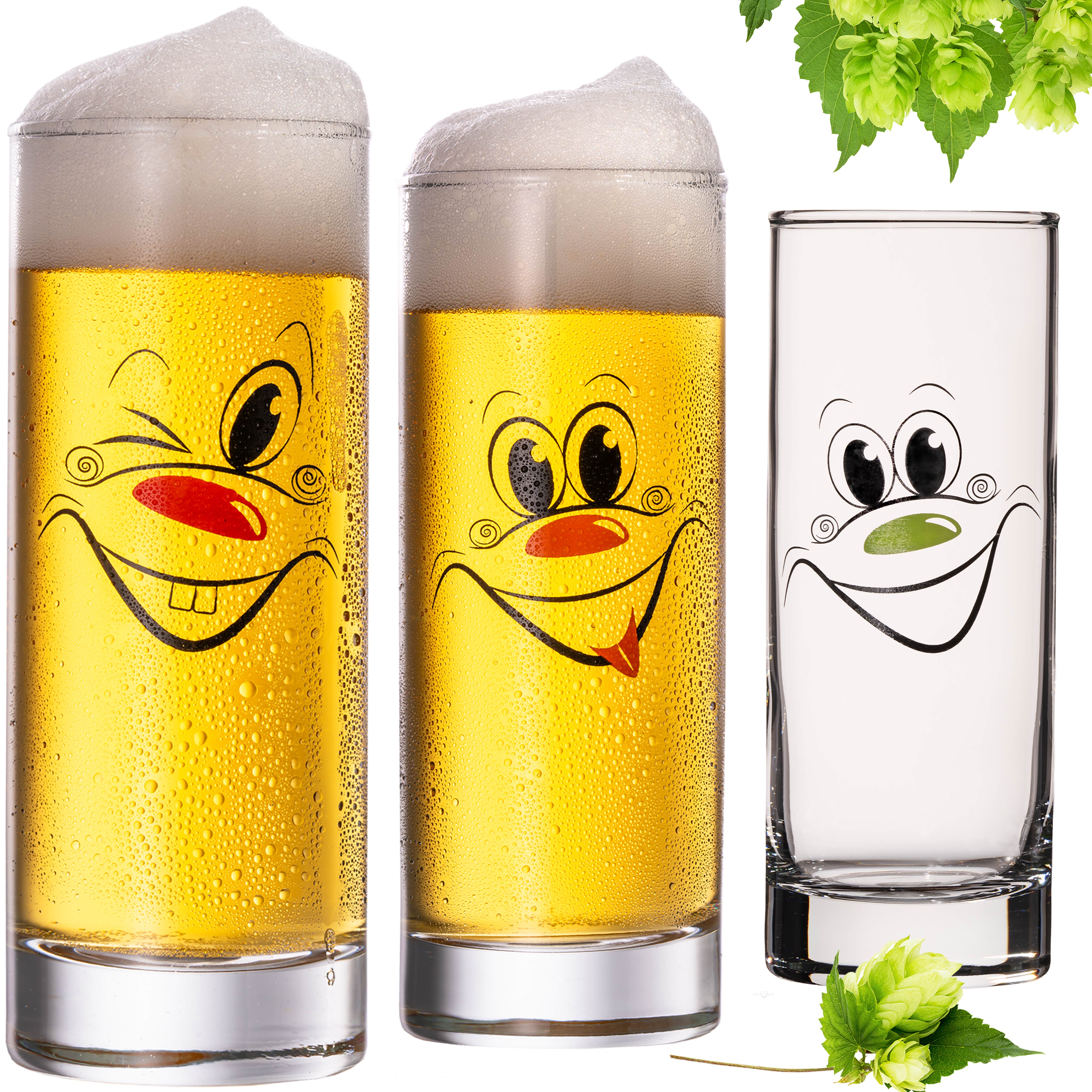 Lieferumfang: 3 hohe Trinkgläser mit drei unterschiedlichen Motiven (lustigen Gesichtern).